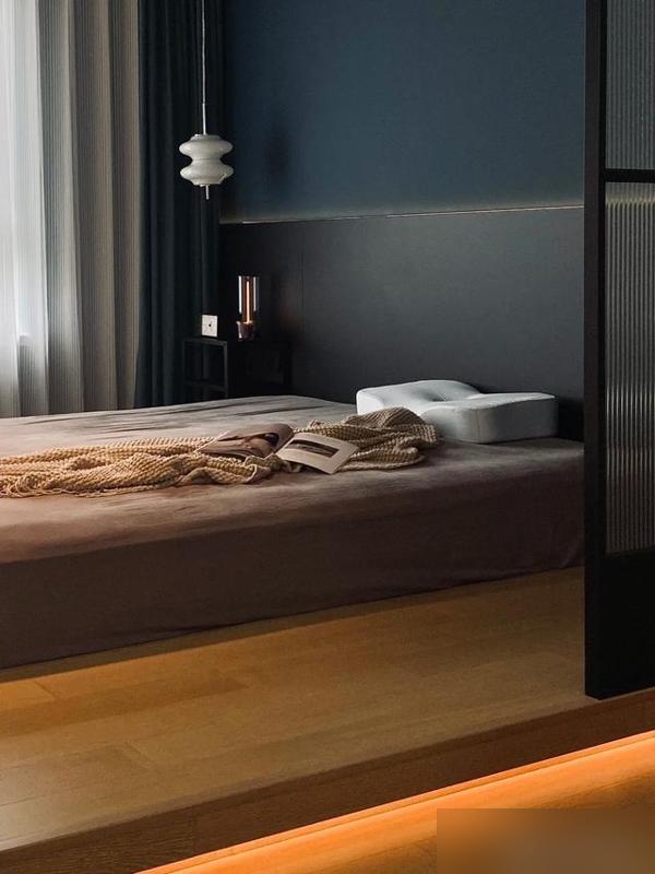 深藍牆面襯着黑胡桃牀頭,暖光燈帶漫射開來,慵懶得像咖啡館卡座。