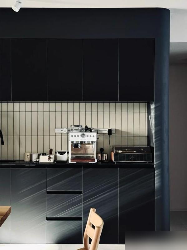 黑色櫥櫃配白牆磚,水墨畫似的留白,油點子一擦就乾淨。