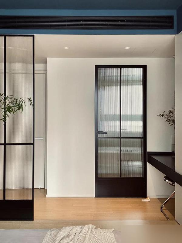 長虹玻璃當屏風更是妙筆,既擋了開門見牀的尷尬,透光又不透視,插兩支南天竹就出意境。