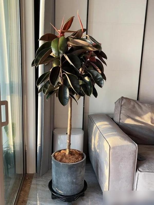 客廳綠植最怕雜亂無章,一棵造型利落的橡皮樹就能鎮住場子。