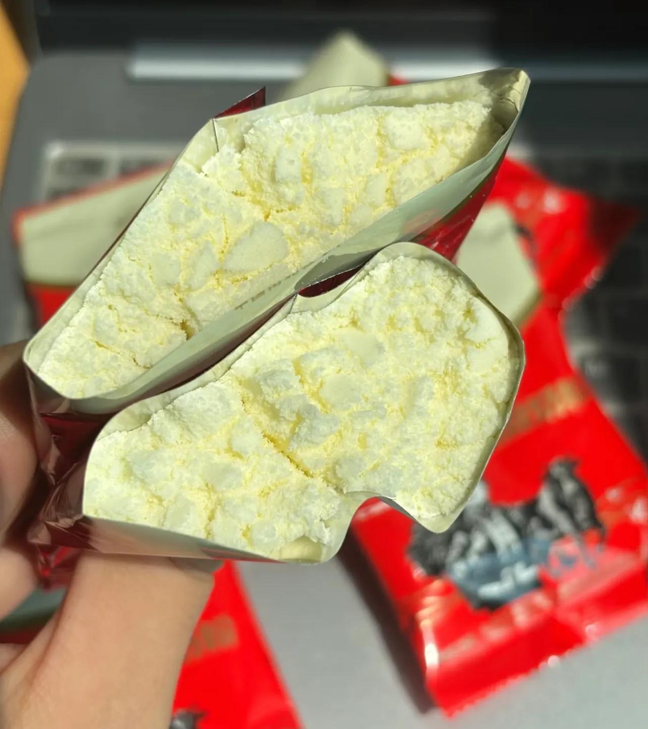 雖然包裝土到掉渣,但衝開瞬間奶香炸裂,甜而不齁,入口很快就化了,完全不粘牙。