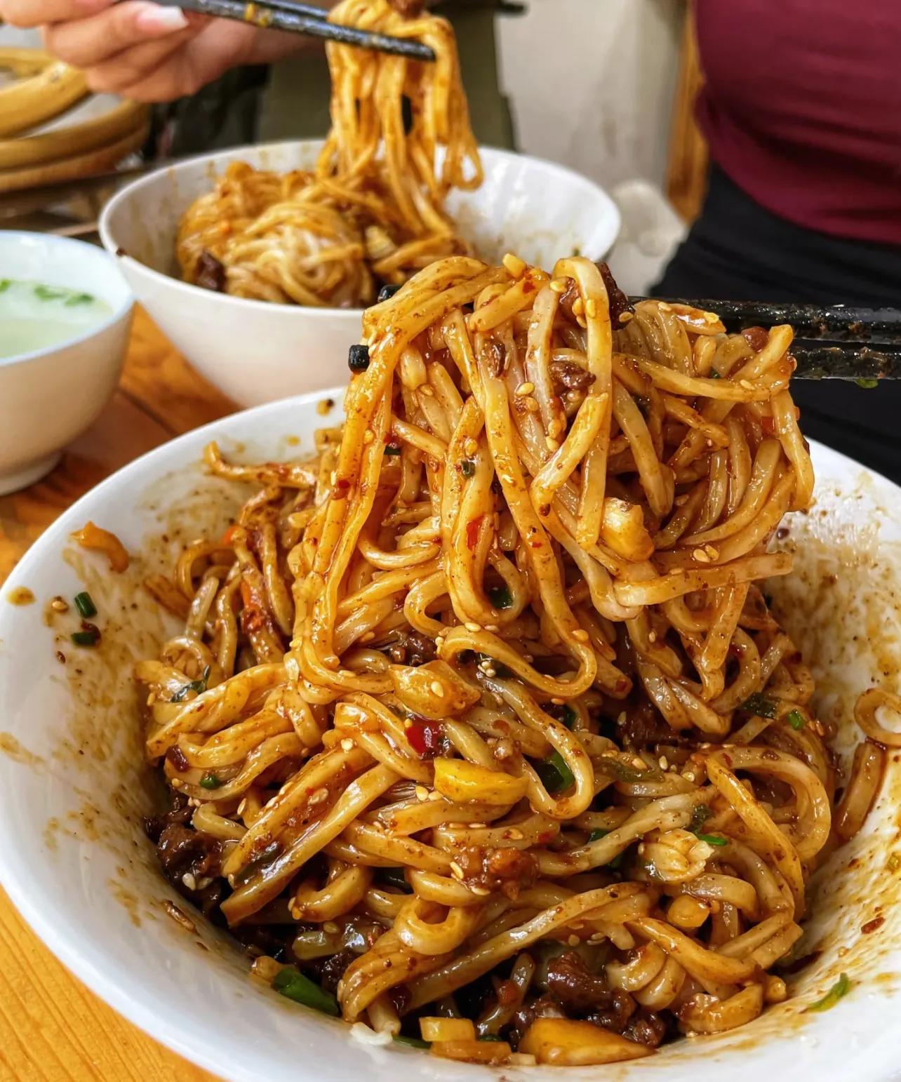 騰衝餌絲可幹拌也可帶湯喫,餌絲用糊辣椒+花生碎+醃菜+蒜油拌開香到鄰居來敲門,餌絲裹滿調料,每一根都帶着酸辣勁,嗦起來嗖嗖響,喫完嘴脣麻到跳舞;