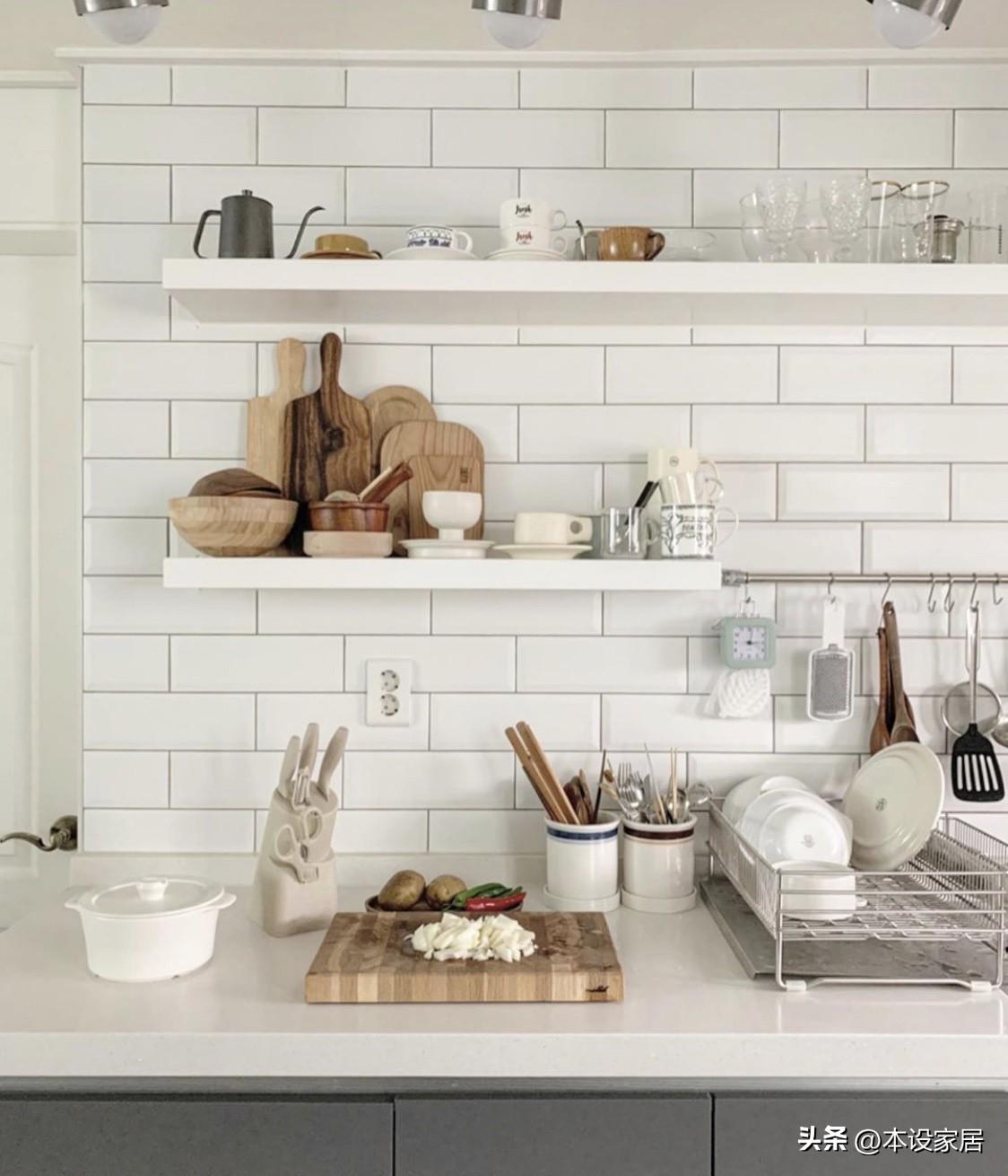 在收納上,這位媽媽充分利用牆面空間,常用的碗碟和水杯直接放在白色擱板上,而烹飪的工具掛牆上,拿取方便。