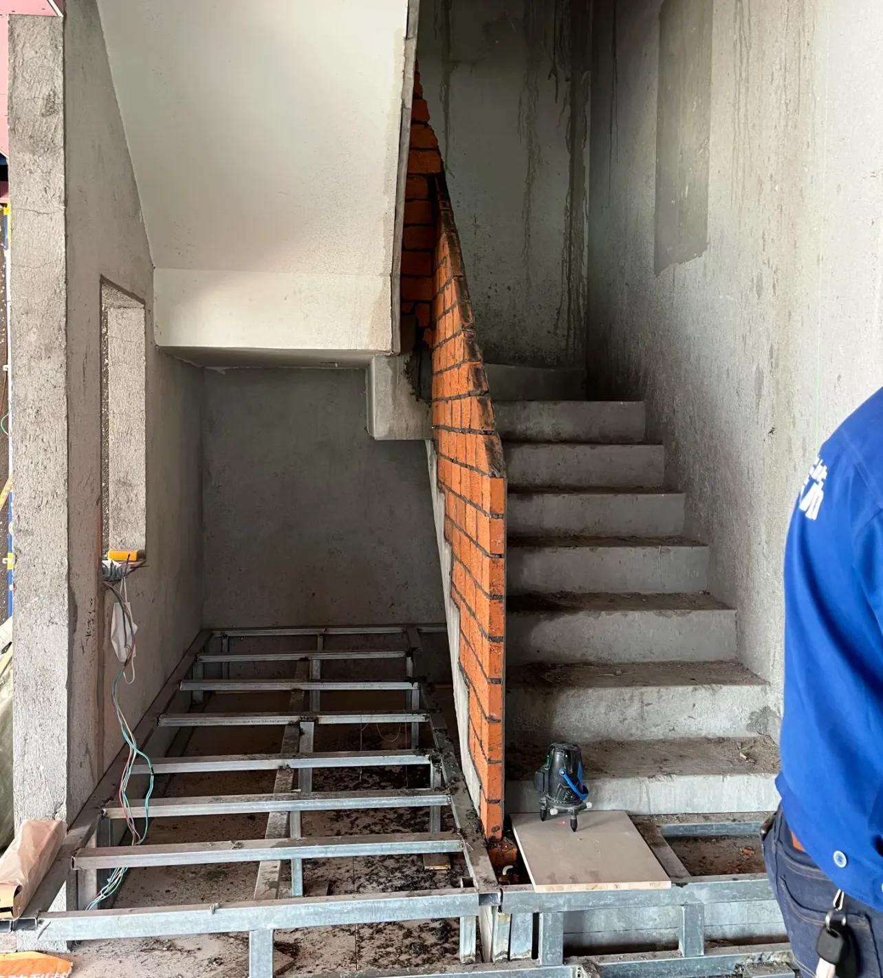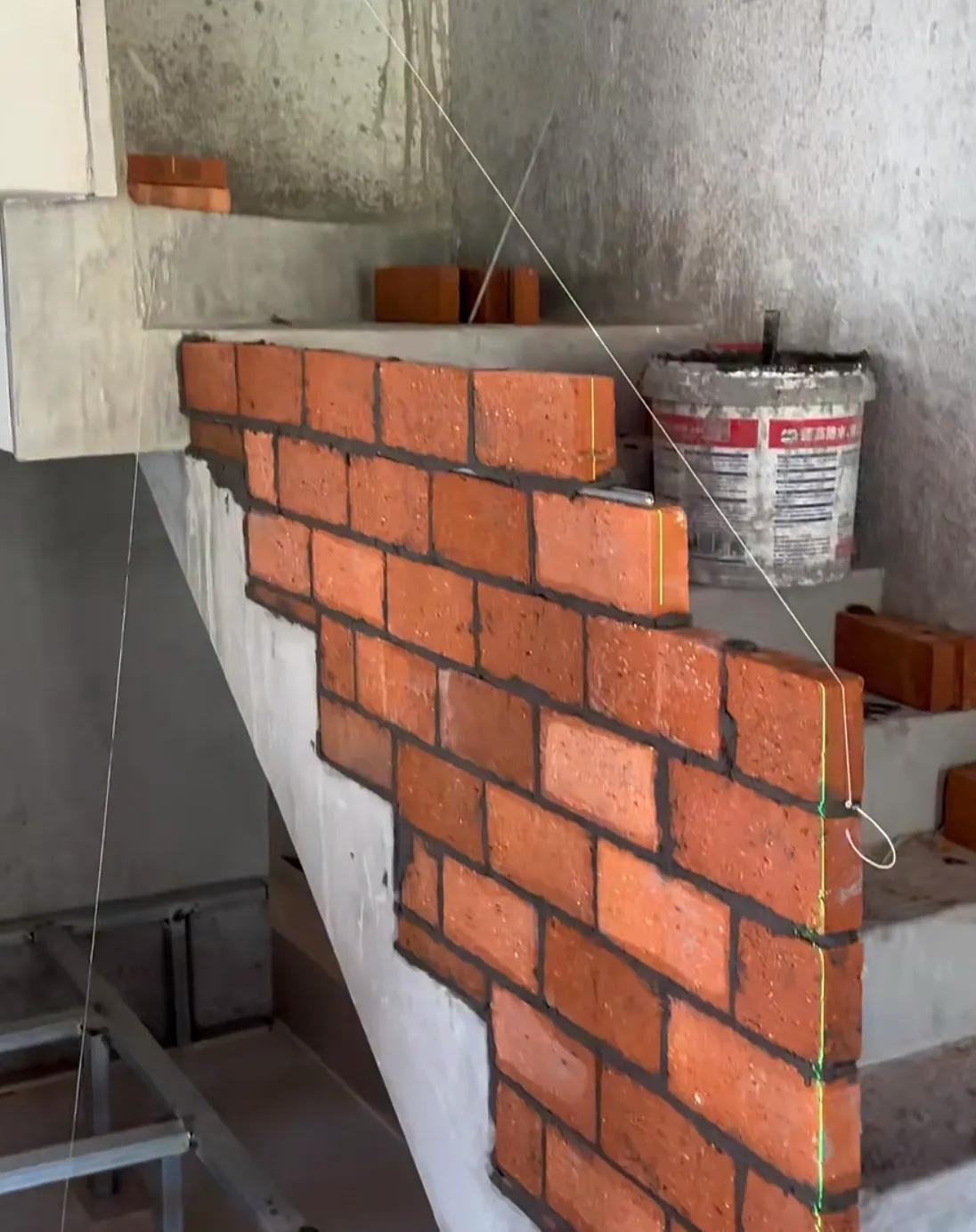 答案是:砌一層,植入一條鋼筋,鋼筋打孔灌入植筋膠,固定在樓梯上。