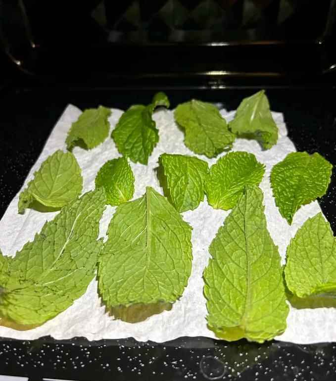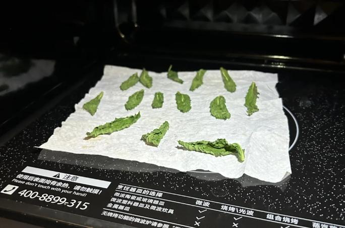 不管是薄荷葉,還是香菜,先“高火”2-3分鐘,然後再取出來看看狀態,根據情況一分鐘一分鐘的繼續高火。直到葉子都呈現脫水乾涸的狀態。