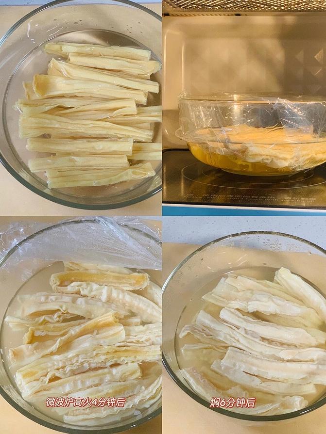 把腐竹放進碗裏,倒入沒過它的水,然後覆蓋上一層保鮮膜(要用PE保鮮膜,不要用PVC保鮮膜),放進微波爐中,設置高火4分鐘。
