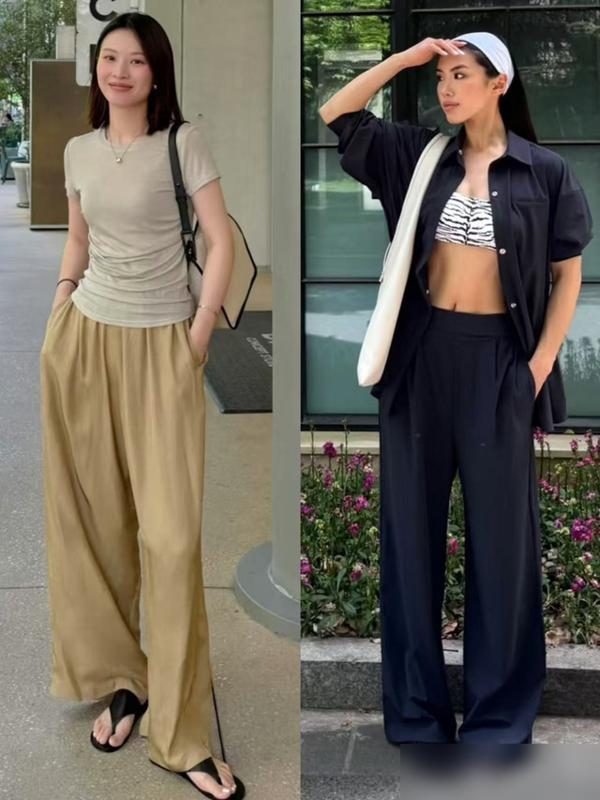 料子要挑厚實點的冰絲或雪紡,太薄反而顯內褲痕還飄不穩;純色系最省心,淺灰薄荷綠隨便搭,上班配襯衫比黑西褲輕盈得多。