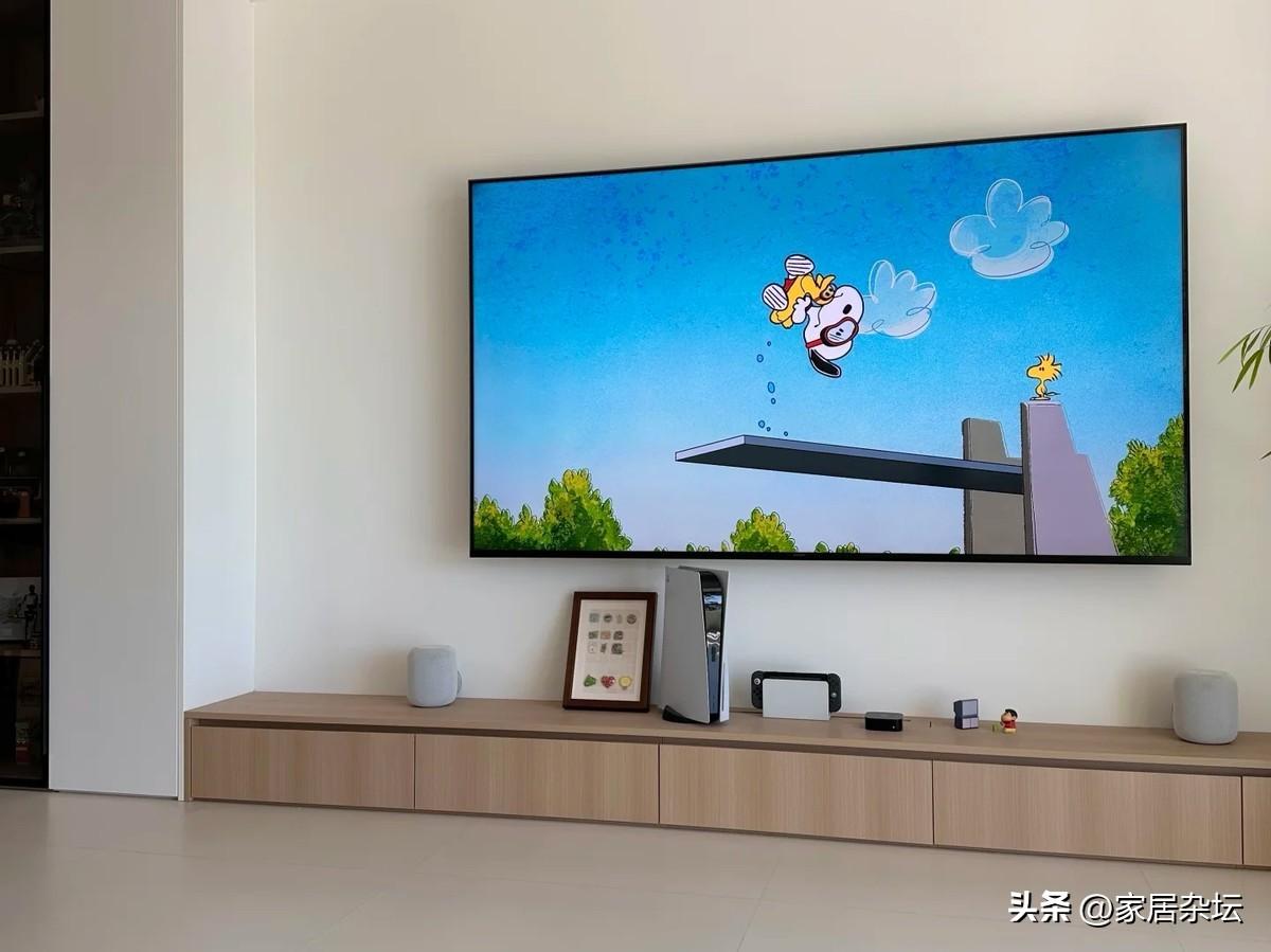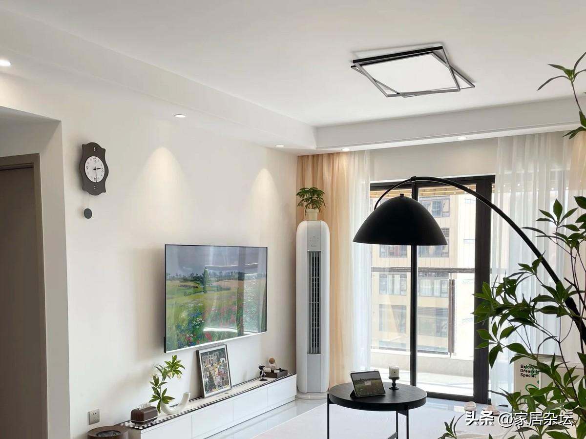 電視牆的核心,就是襯托電視,營造客廳的氛圍。建議大家,選擇簡單的牆面,例如乳膠漆,旁邊點綴些綠植,不僅便宜,而且感覺更親切了。
