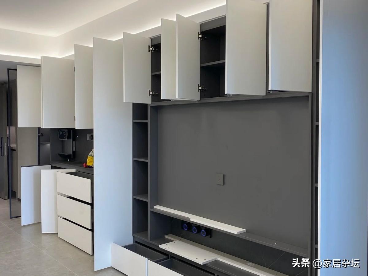 客廳是需要一個乾淨整潔的。建議儘量安裝帶門的收納櫃,例如平板門,玻璃門。而且,是不透的玻璃門,增加隱藏。如果想展示飾品,可留出局部透明玻璃門和開放格。