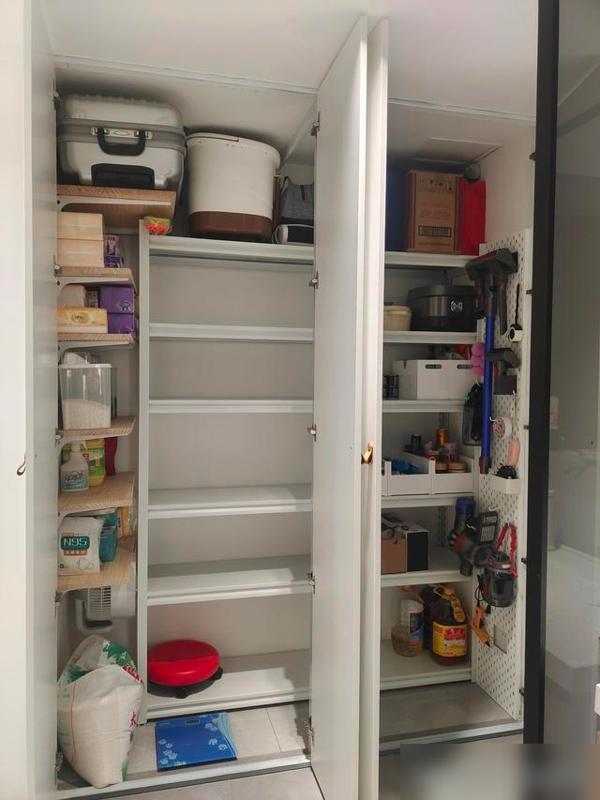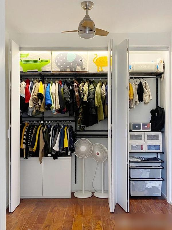 衣櫃同樣適用,行李箱電風扇往裏一塞,地面空出來,拖地都順手。