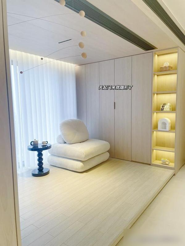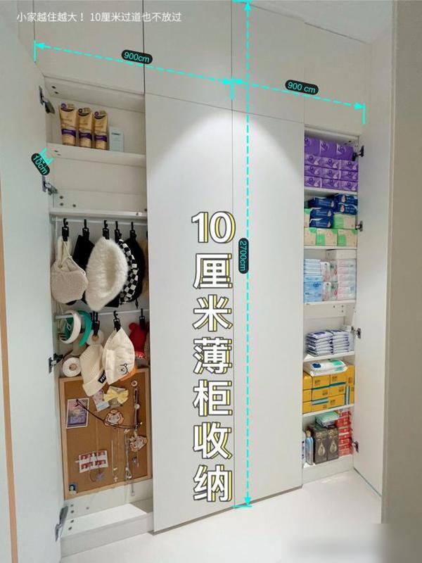 隱形櫃在過道窄縫裏發光,薄薄十公分櫃體門板同色牆,打開別有洞天,配飾雜物全收好,表面簡潔不突兀。