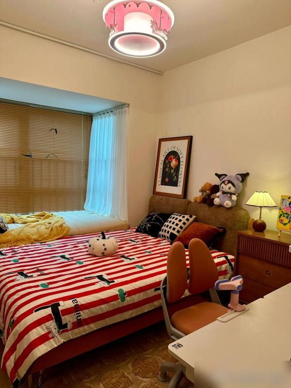 粉雲朵燈下,條紋牀單配着手縫玩偶,書桌綠植旁立着粗陶花瓶。