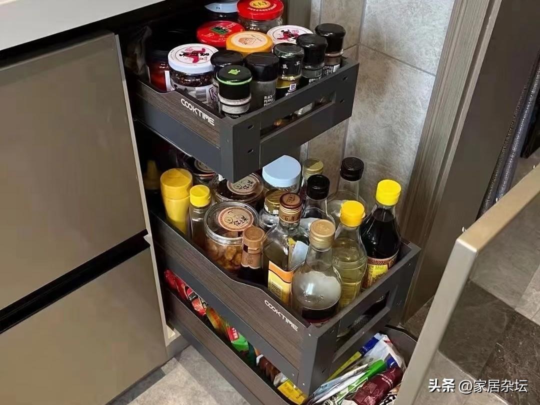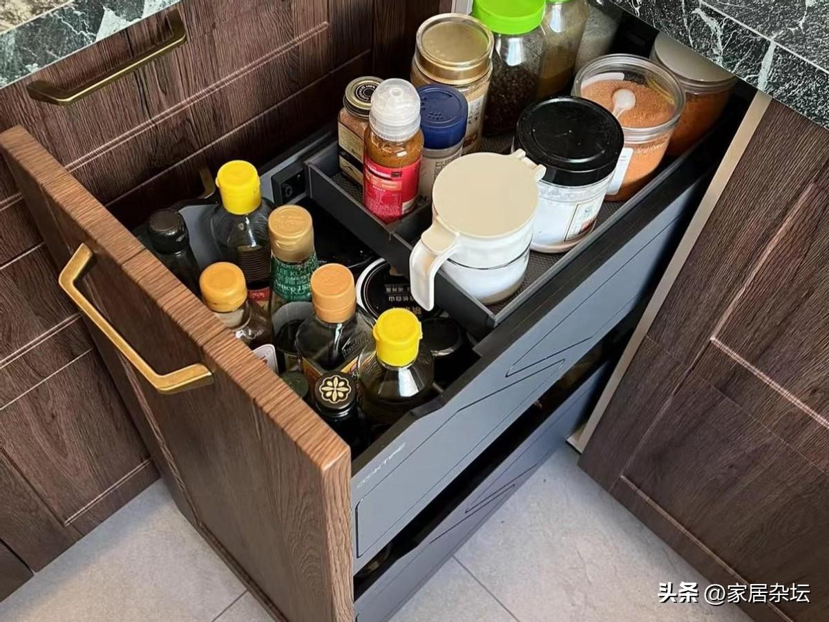 這一次裝修,我家是在家裏的竈臺左側的檯面下面裝了一個不鏽鋼的小拉桿調料盒。推進去,檯面上面空無一物;用的時候,一拉就出來了。
