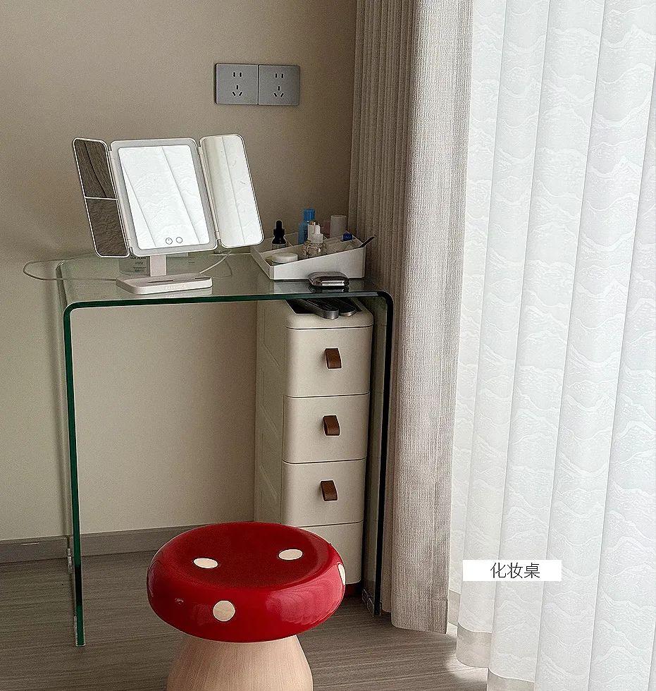 直到我找到了這個,通透環保且存在感很低的[玻璃化妝桌],顏值很高,凳子收納進去以後美貌依然。