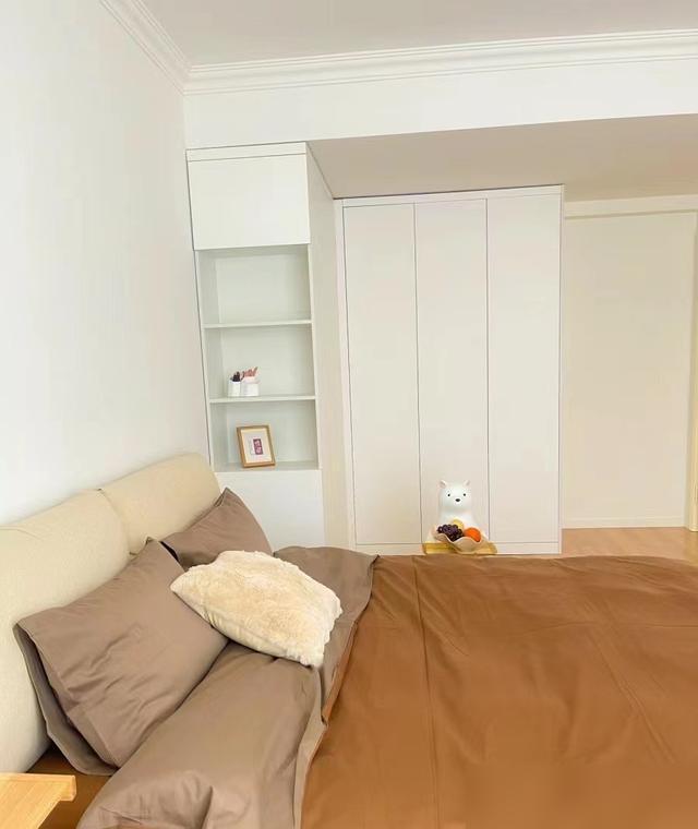 臥室一櫃到頂,開放格放小物件,雜物少了,掃地機器人跑得歡。