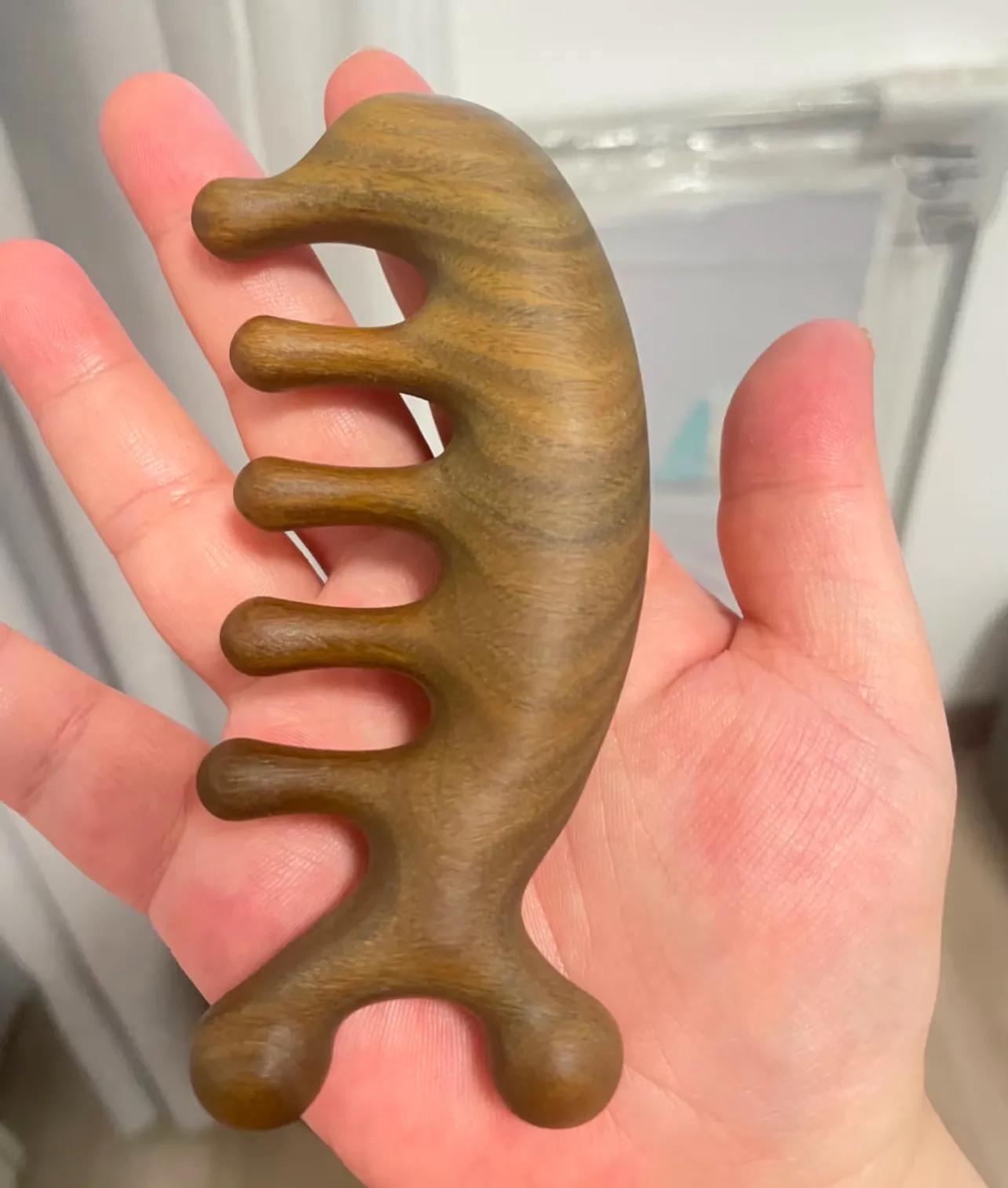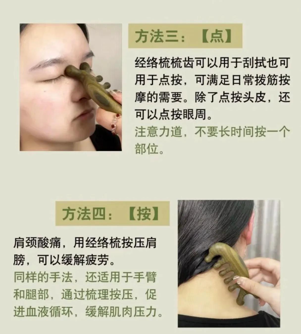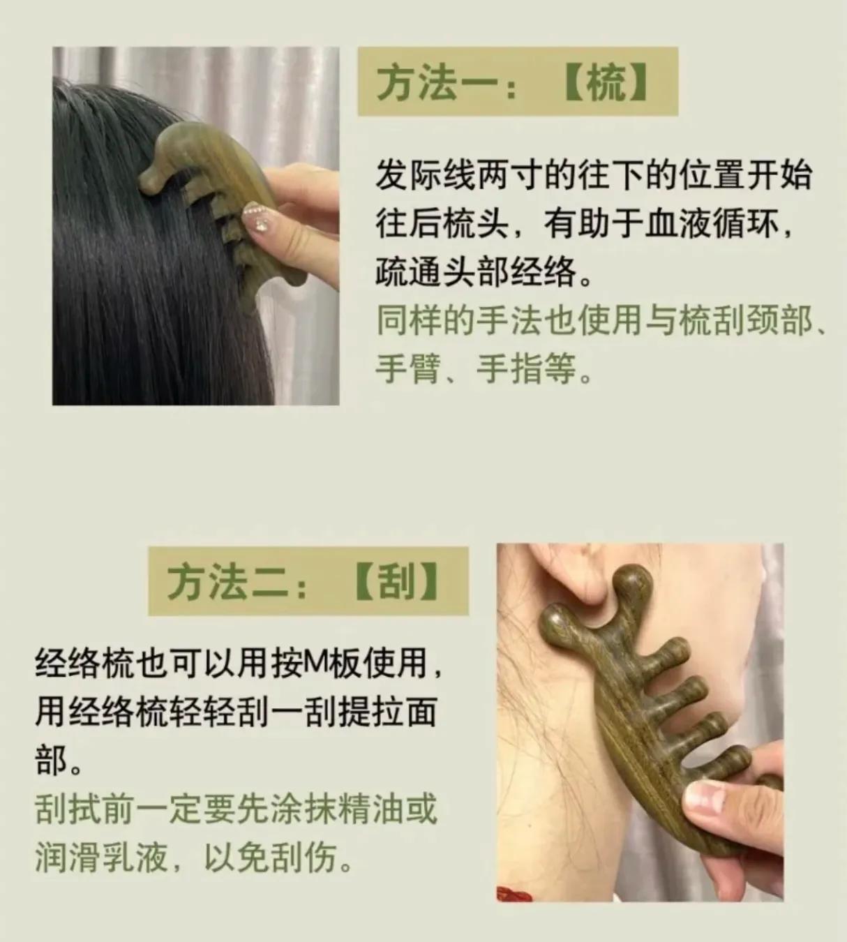 剛開始我主要用它梳頭,每天順着經絡方向按摩頭皮,促進頭部血液循環和毛囊發育,氣血跟着活絡起來,頭髮越梳越有光澤,這把我震驚到了,開始解鎖新用法。