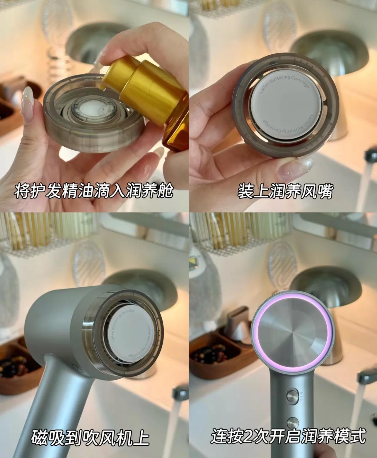 讓我驚豔的是徠芬新增的磁吸潤養風嘴!把精油滴進潤養艙,切換潤養模式,58℃恆溫風裹着精油,精準 “投餵” 每根髮絲吹完後,梳子一滑到底,打結星人直接愛了。