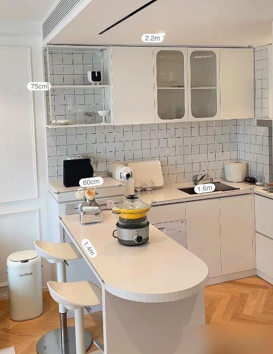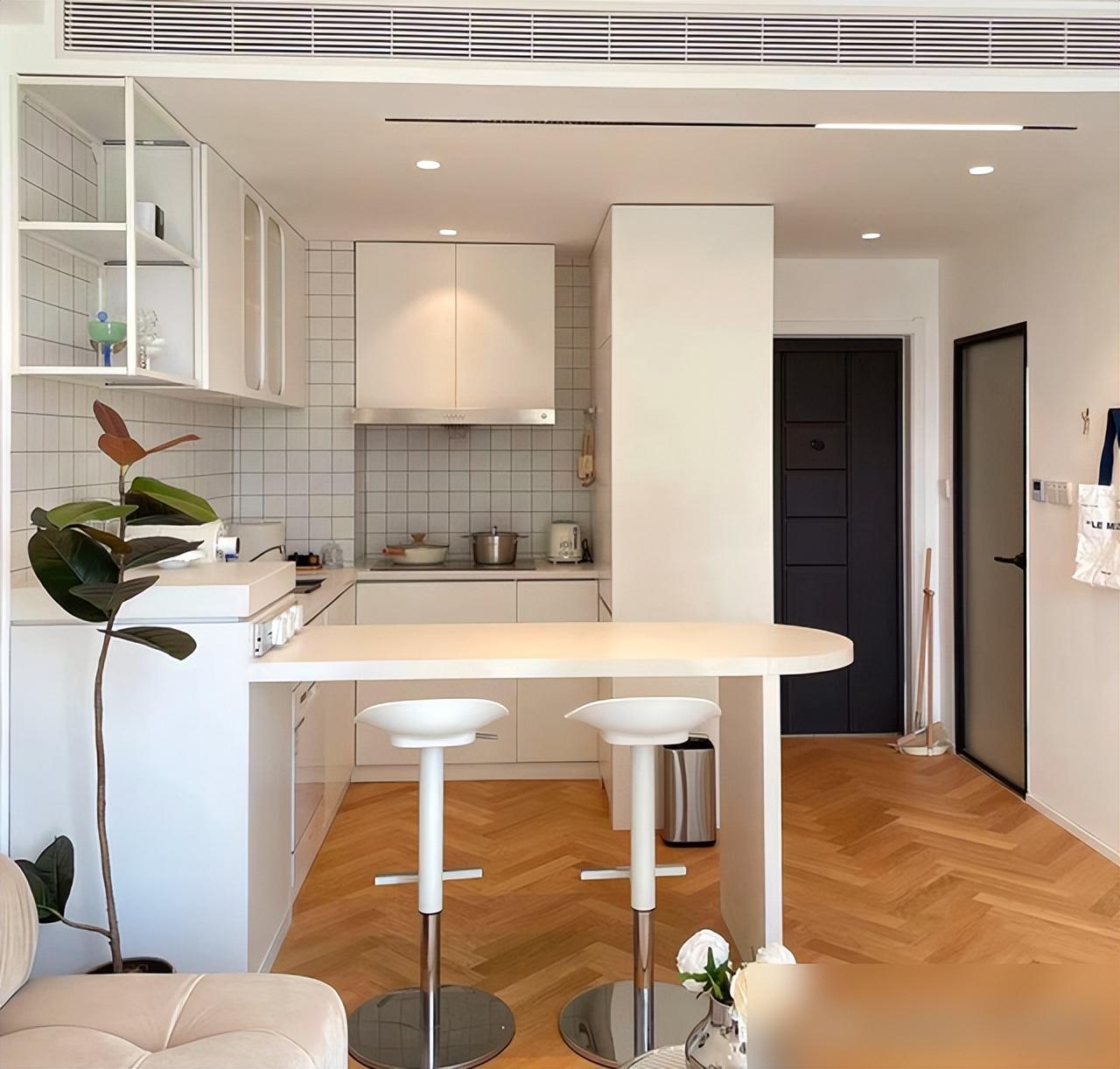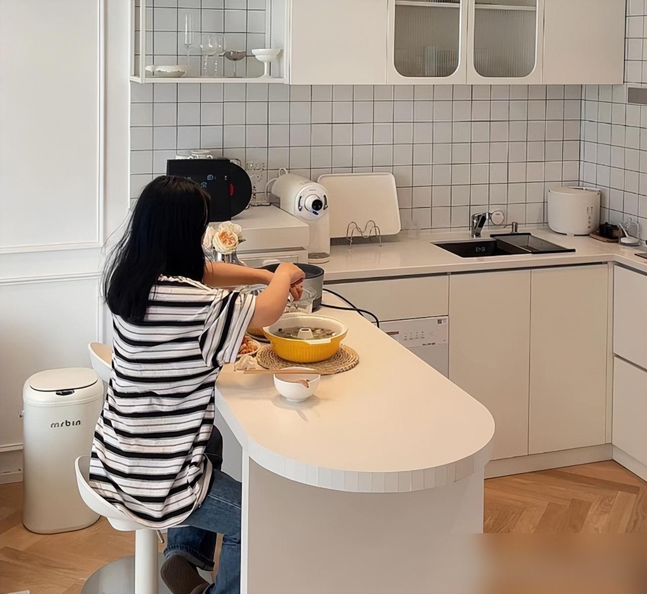 開放式廚房刷得雪白,配上原木地板,L型操作檯還延伸出個小吧檯,下班煮碗麪往那兒一坐,這不就是理想中的小確幸嗎?