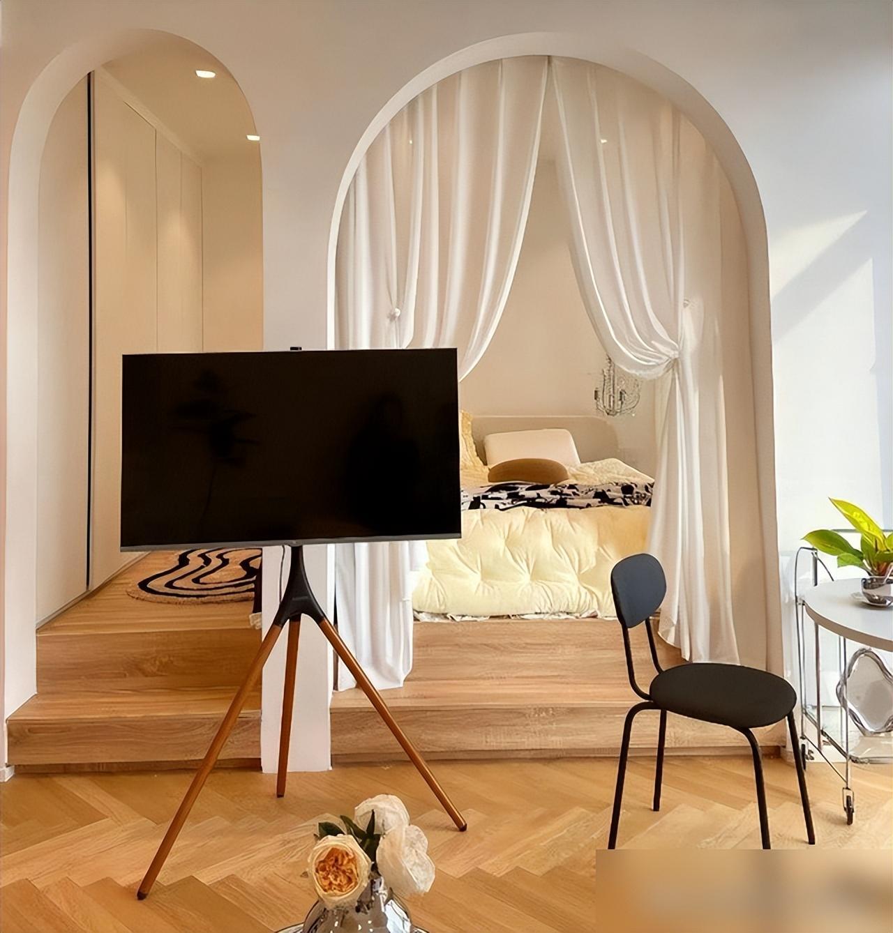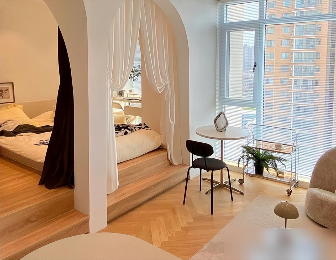 牆角懸空的梳妝檯把瓶瓶罐罐歸置得整整齊齊,軟乎乎的奶色雙人牀看着就想躺上去打個盹兒。