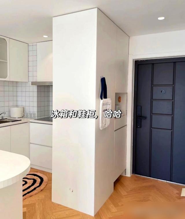 玄關櫃兩面用的設計太絕了,一面塞鞋子,另一面藏冰箱,進門就能感受到那種“不浪費一寸地”的巧思。