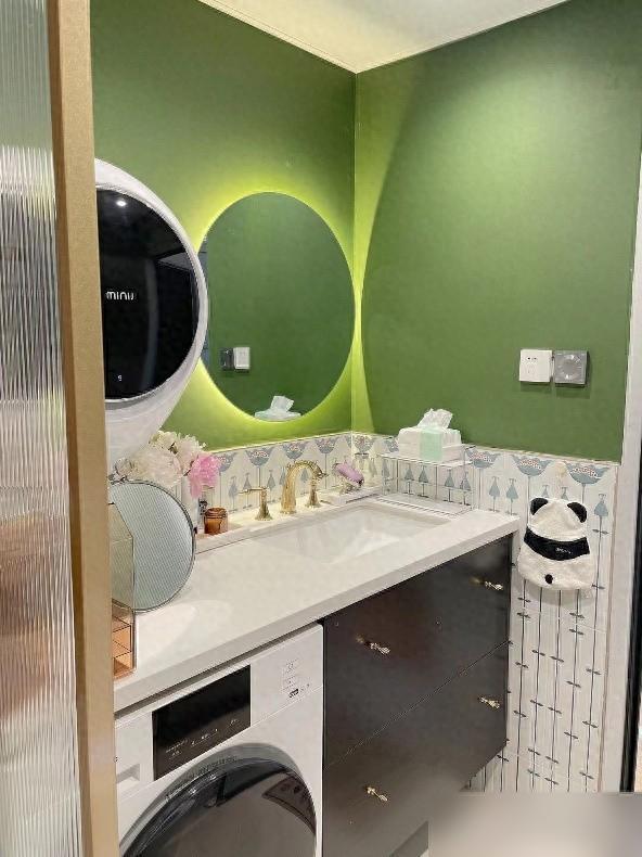 衛生間雖小卻一點不含糊,綠色牆面復古味兒十足,玻璃隔斷乾溼分離,花灑和浴缸居然都塞進去了。