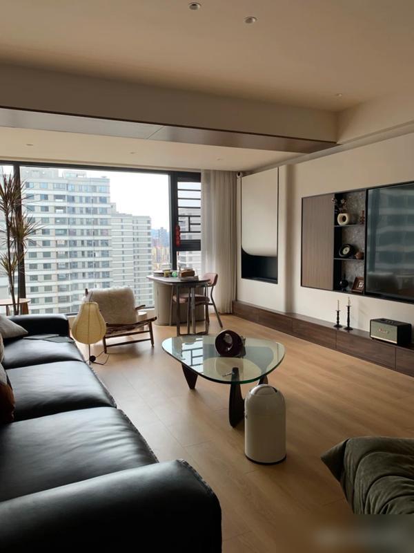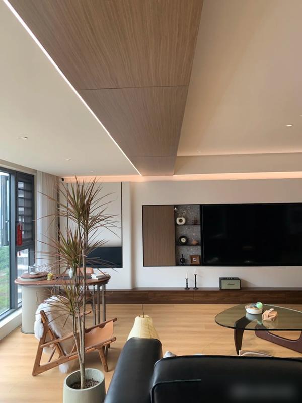 尤其那面電視牆,白底黑框嵌胡桃木的碰撞,圓潤轉角消解了厚重感,比清一色的巖板多了溫度。