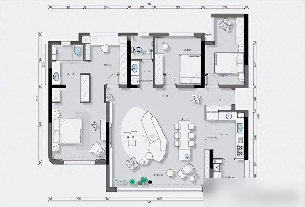 客餐廳打通後,她居然沒用屏風隔斷,一張弧形沙發就劃出了領域感。