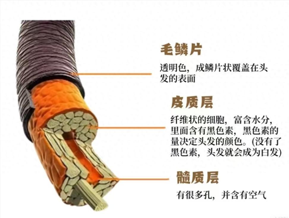 但隨後在皮質層的觀測中,發現吹風機組結構完整,獨獨在自然乾燥組觀察到了:細胞膜複合物(CMC)破壞,會導致頭髮韌性下降,易斷裂。