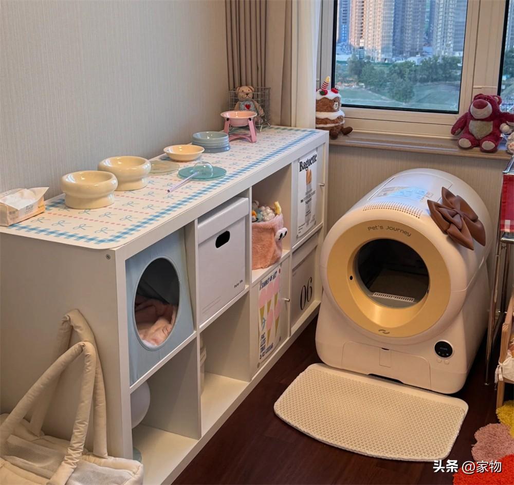 一個小地墊,上面放上三層展示架用來收納貓咪的各種小罐頭,旁邊甚至還有個迷你的沙發貓窩,這姑娘還真把這當成次臥佈置了!只不過所有的傢俱都是小一號的,看起來很可愛,有種過家家的感覺。