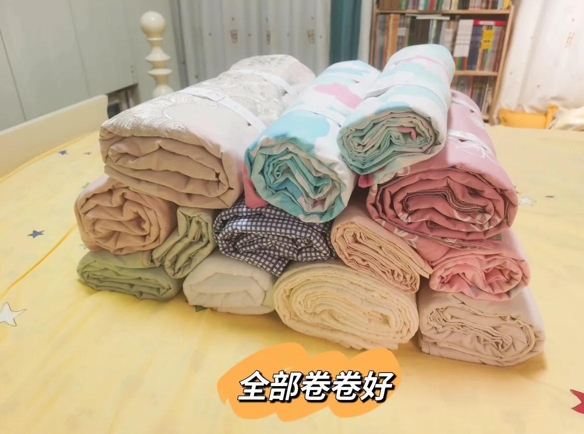 以前家裏的牀品套件、薄被子,如果一個壓一個疊放,拿取的時候很費力,而且很容易拉亂,用它捆起來,一個一卷,拿取方便,也互不干擾;