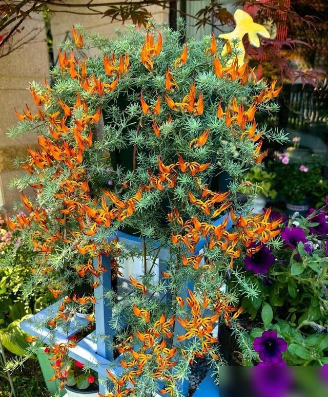 開花更絕,橙紅花瓣捲成小管,活脫脫鸚鵡撅着嘴,陽光下跟火苗似的跳,熱情得很。