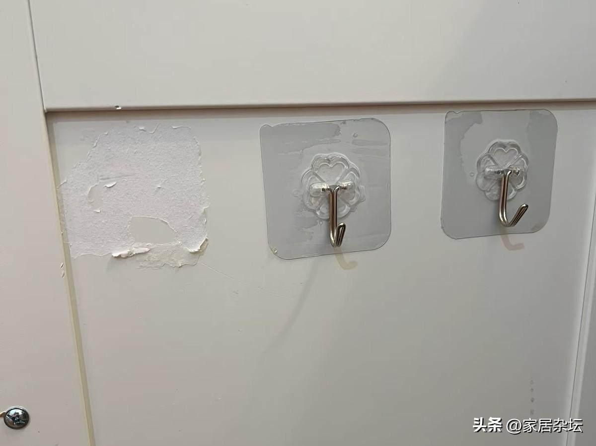 當初貪便宜,花了幾塊錢買了一盒劣質粘鉤。說實話,粘的還挺結實的。往下撕掉都難撕,撕完以後,牆上留的都是疤痕。
