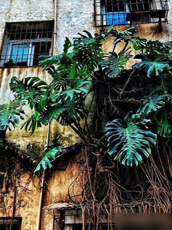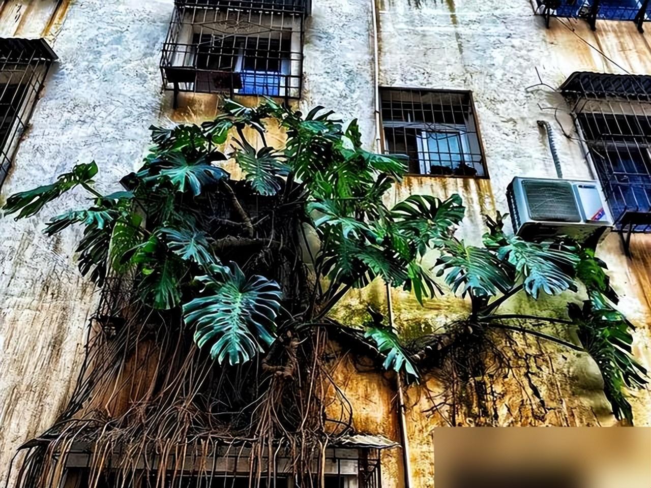 根莖垂落像道綠簾子,葉子寬得能當傘使,從一樓直爬上二樓欄杆,活脫脫把水泥牆變成了熱帶雨林。