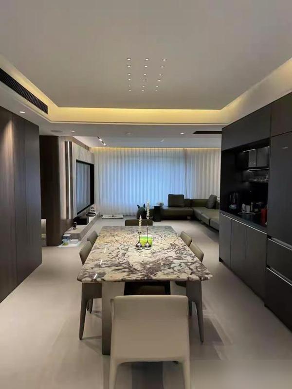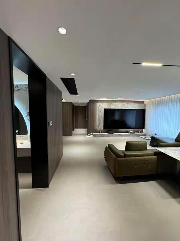 無主燈設計配合隱藏燈帶,晚上開燈後整個空間像裹了層柔光濾鏡;全屋櫃體嚴絲合縫嵌入牆面,關上門就是清清爽爽一面牆。