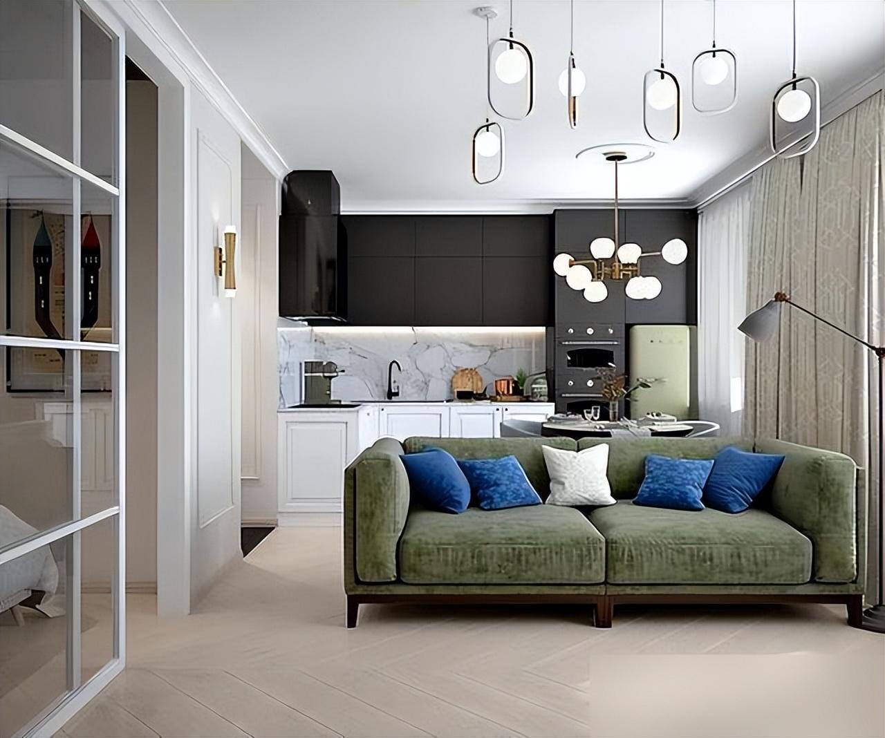 淺米色牆配淺木地板,搭上深綠沙發和灰靠墊,不花哨卻像幅淡彩畫——誰說小房子就得憋屈?
