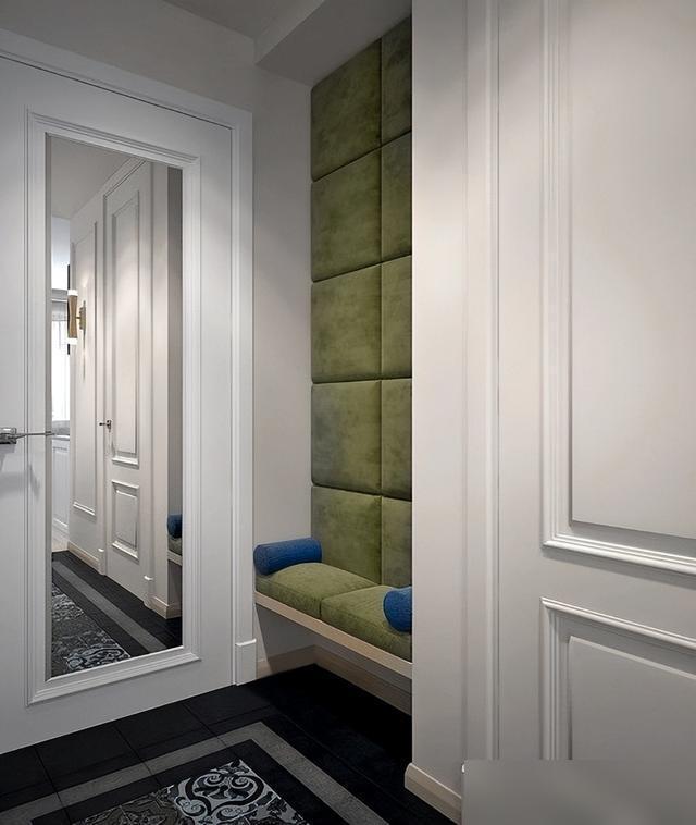 固定式換鞋凳貼着牆,老人家換鞋不用彎腰費力,門後一面全身鏡,照得窄道亮堂堂,連帶着心情都敞亮了。