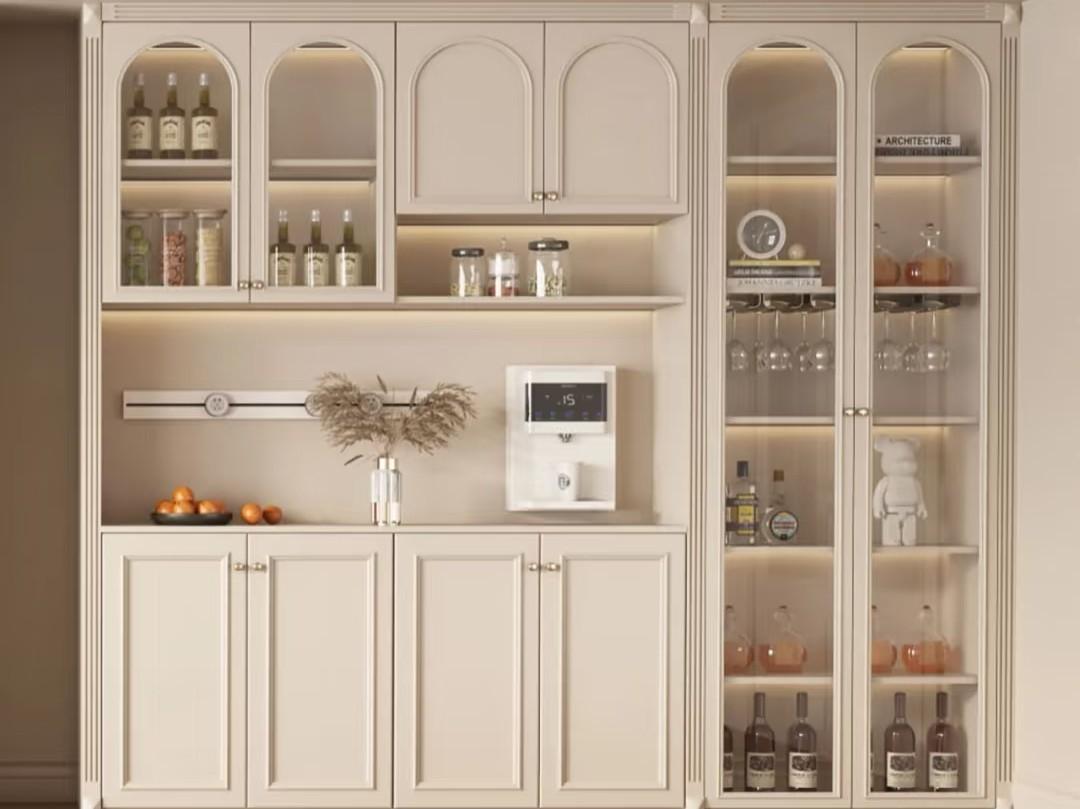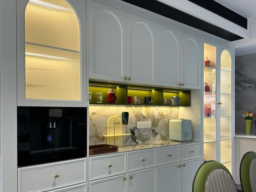 這次裝修,就放棄了開放式酒櫃,取而代之的是局部酒櫃。酒櫃裝了玻璃門,即使不放酒,放一些擺件也是很好看的。
