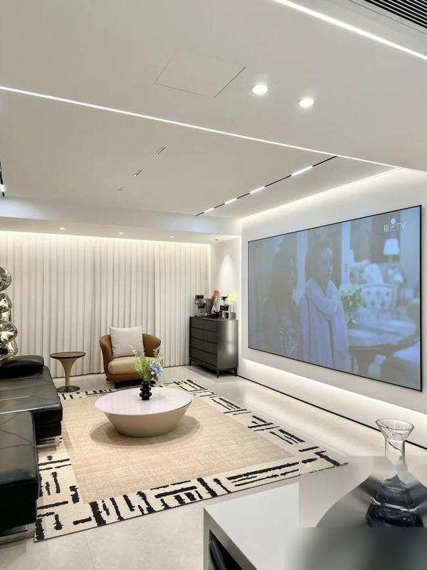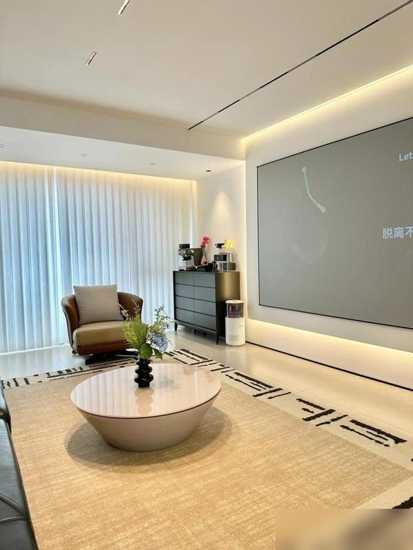懸空電視牆底透出的暖光,不光好看還省了清潔麻煩,133英寸巨幕往中間一掛,下班蜷沙發追劇,疲憊立刻煙消雲散。