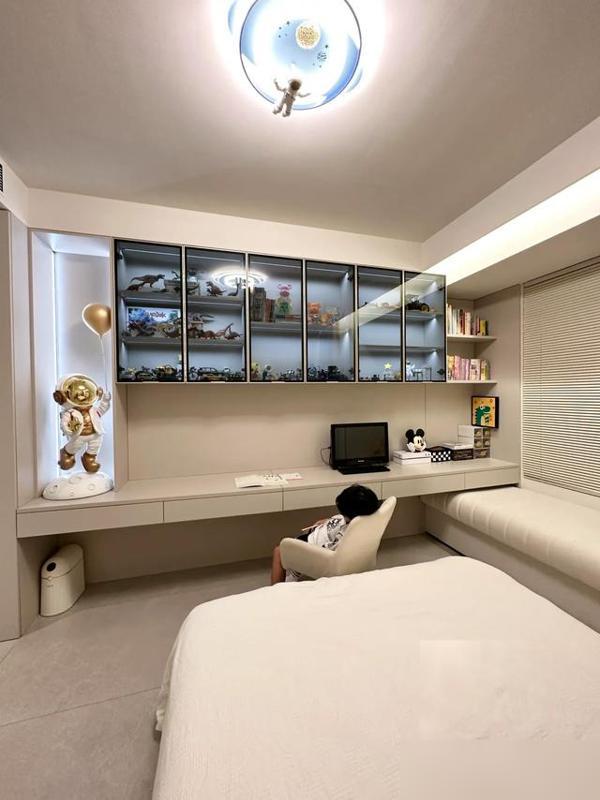 書房懸浮書桌加玻璃吊櫃,辦公看書兩不誤,視覺上輕盈不壓人。