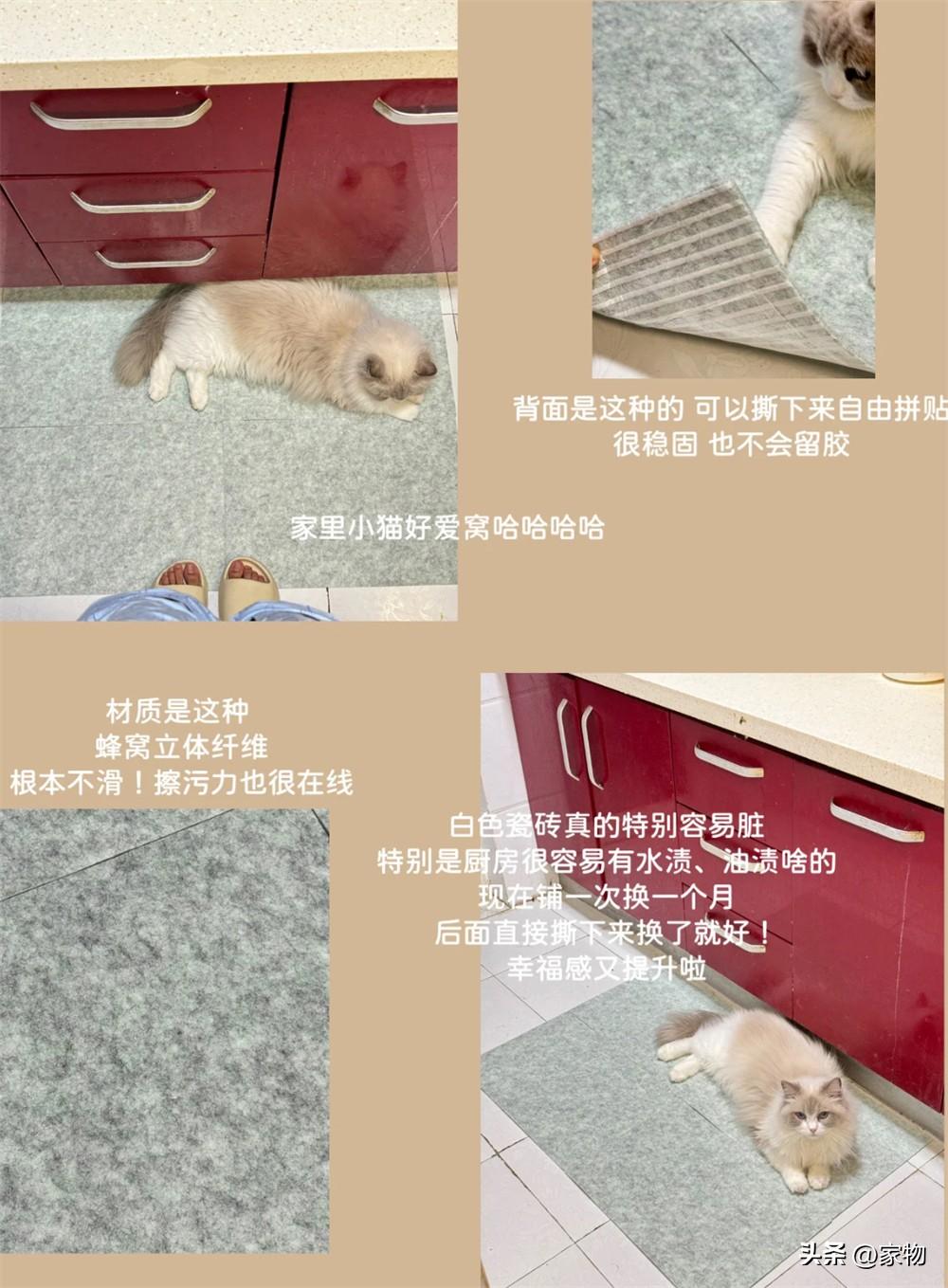 尤其適合鋪在廚房容易濺水濺油的地方,不僅沒有什麼安裝成本,同時還能保護地面,盛接油污。