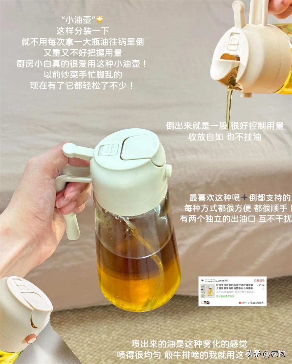 如果家裏只准備留一個油壺,我個人是建議留這種可倒也可噴的多功能油壺,平時需要均勻鋪油的時候就用噴霧,而需要“寬油”的時候,則直接打開上面的卡扣往鍋裏傾倒即可,使用方式非常靈活。