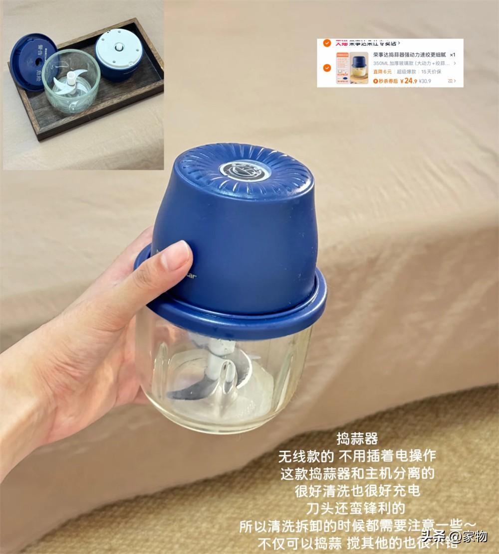 這種電動攪蒜器也是個很好用的小玩意,無論是搗蒜沫,還是絞肉餡,都可以用它,別看小小一個,電機卻不比那種大型的絞肉器差,關鍵還非常省地,放櫥櫃裏一點也不佔地。