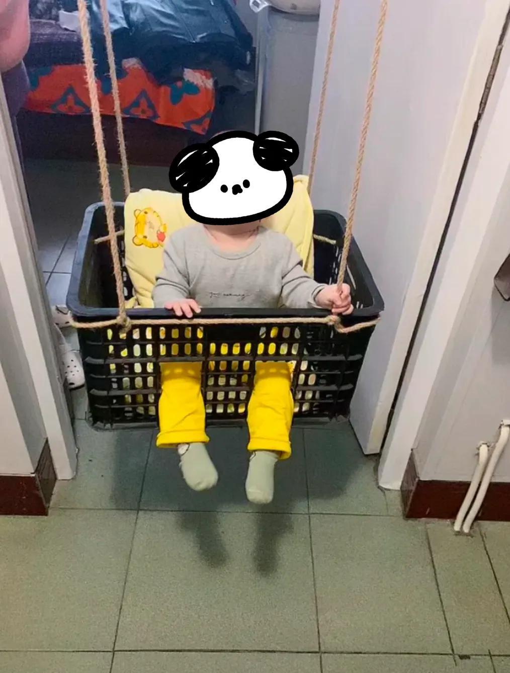 沒想到吧,水果筐還能當鞦韆用,剪開兩側的網格,剛好能讓雙腿自然垂落,用粗麻繩穿過筐體四角的孔洞,放個靠墊坐墊,就是一個鞦韆了!