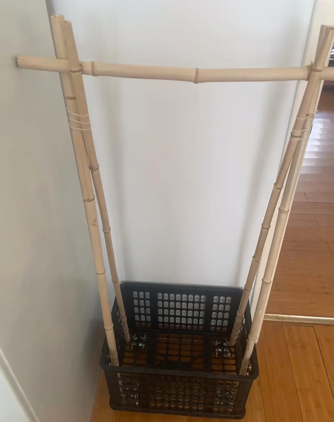 用竹子或打磨過的木棍組合,紮帶或麻繩綁住都可以,下面固定水果筐,就是一個髒衣簍兼次淨衣架,加上萬向輪,就可以移動了。