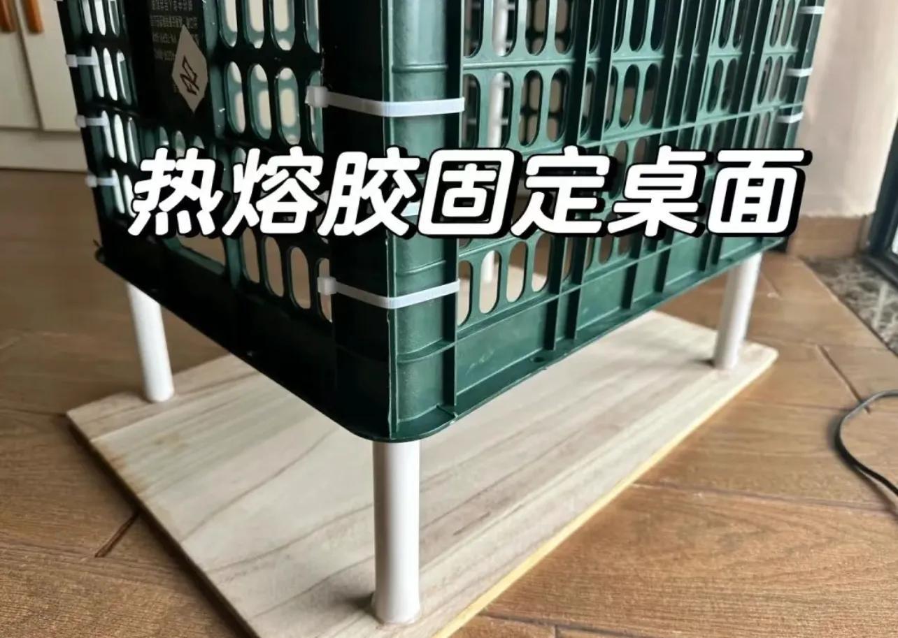 選一塊桌面,提前量好標記一下位置,用熱熔膠把pvc管固定在桌面四角,再把水果筐倒扣對準pvc管位置。