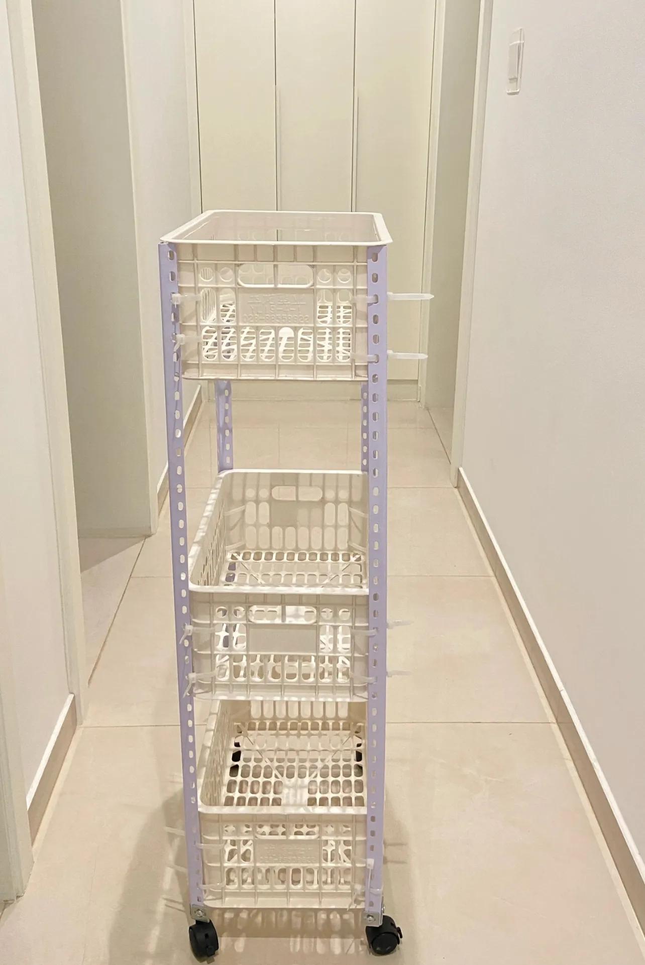 pvc管固定多個水果筐,就是一個高置物架,放在玄關,出門進門各種雜物都可以隨手一放;放在廚房,可以放些不需要進冰箱的菜,還卡得住保鮮膜、烘焙紙。