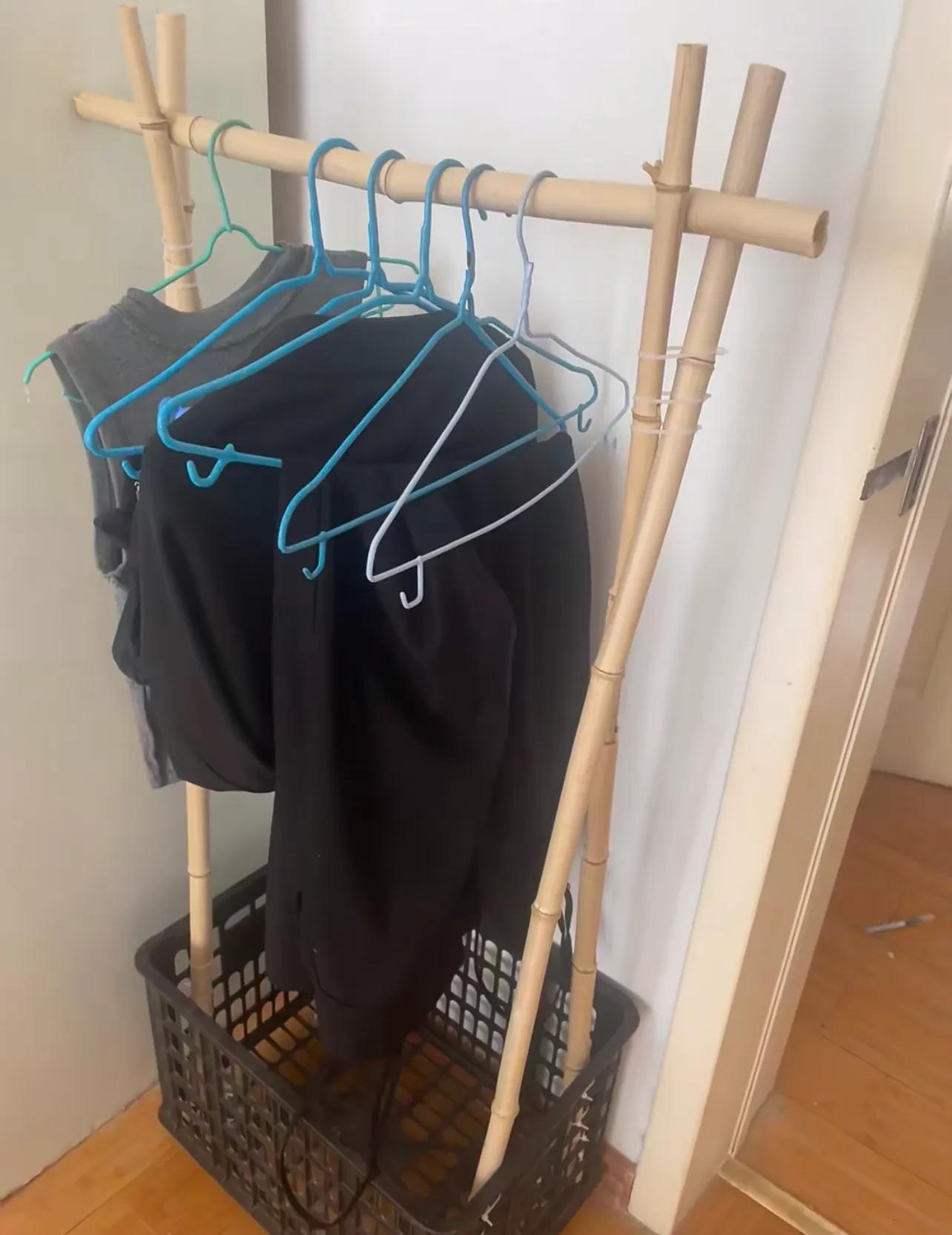 這是極簡版原木風衣架,如果想要更有氛圍感一點,可以把筐換成白色,編點麻繩加塊花布,加點燈條裝飾一下,豐儉由人嘛。