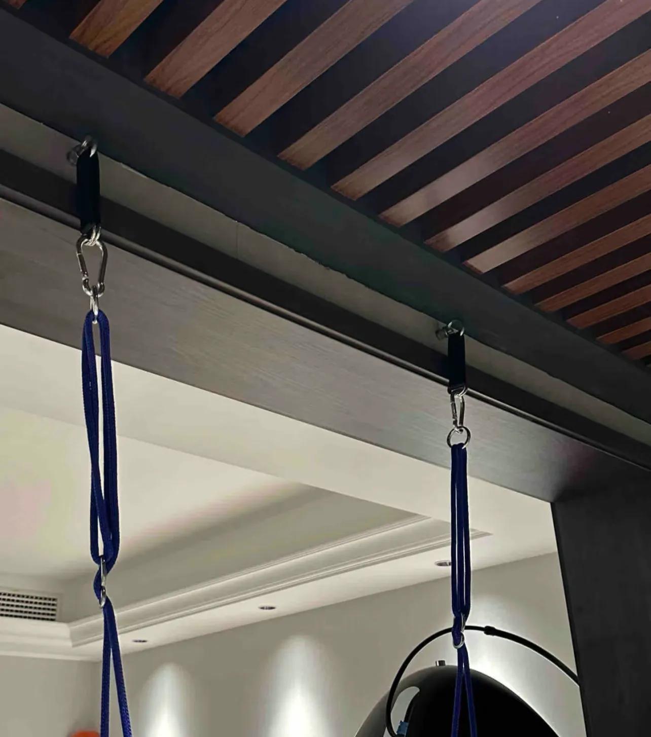 在室內橫樑打上膨脹螺絲固定,離地高度不要太高,以防萬一,不至於受傷,而且最好體重輕一點的孩子比較安全。