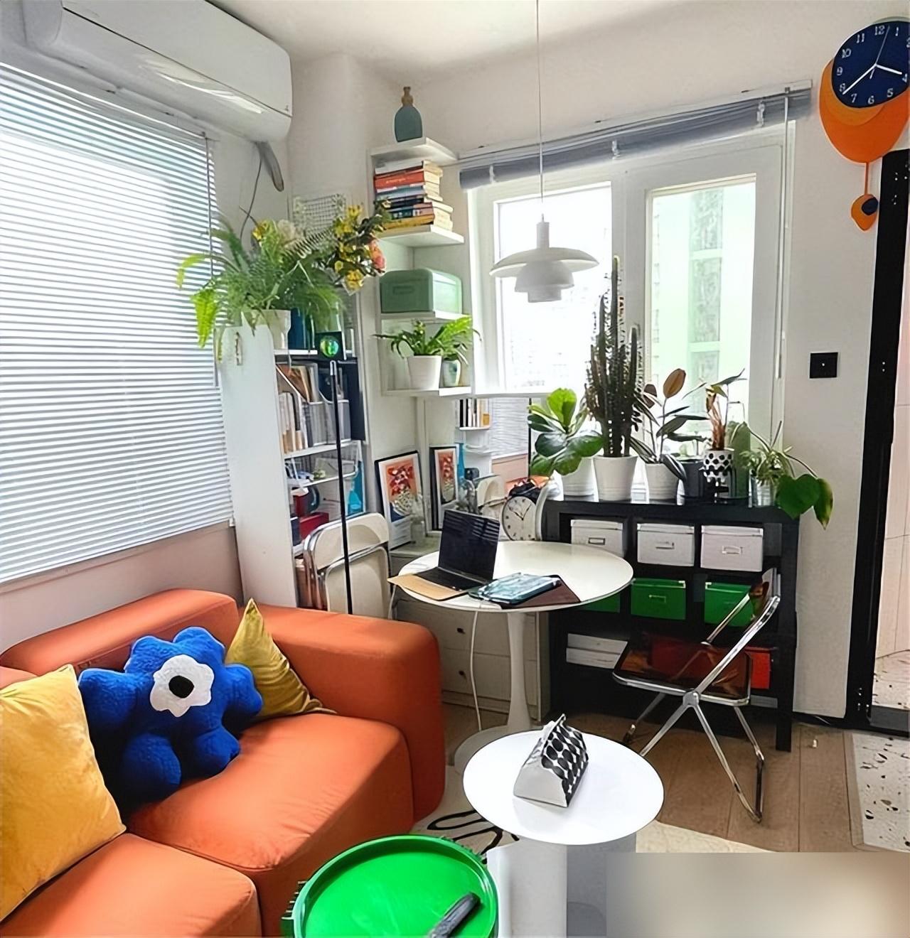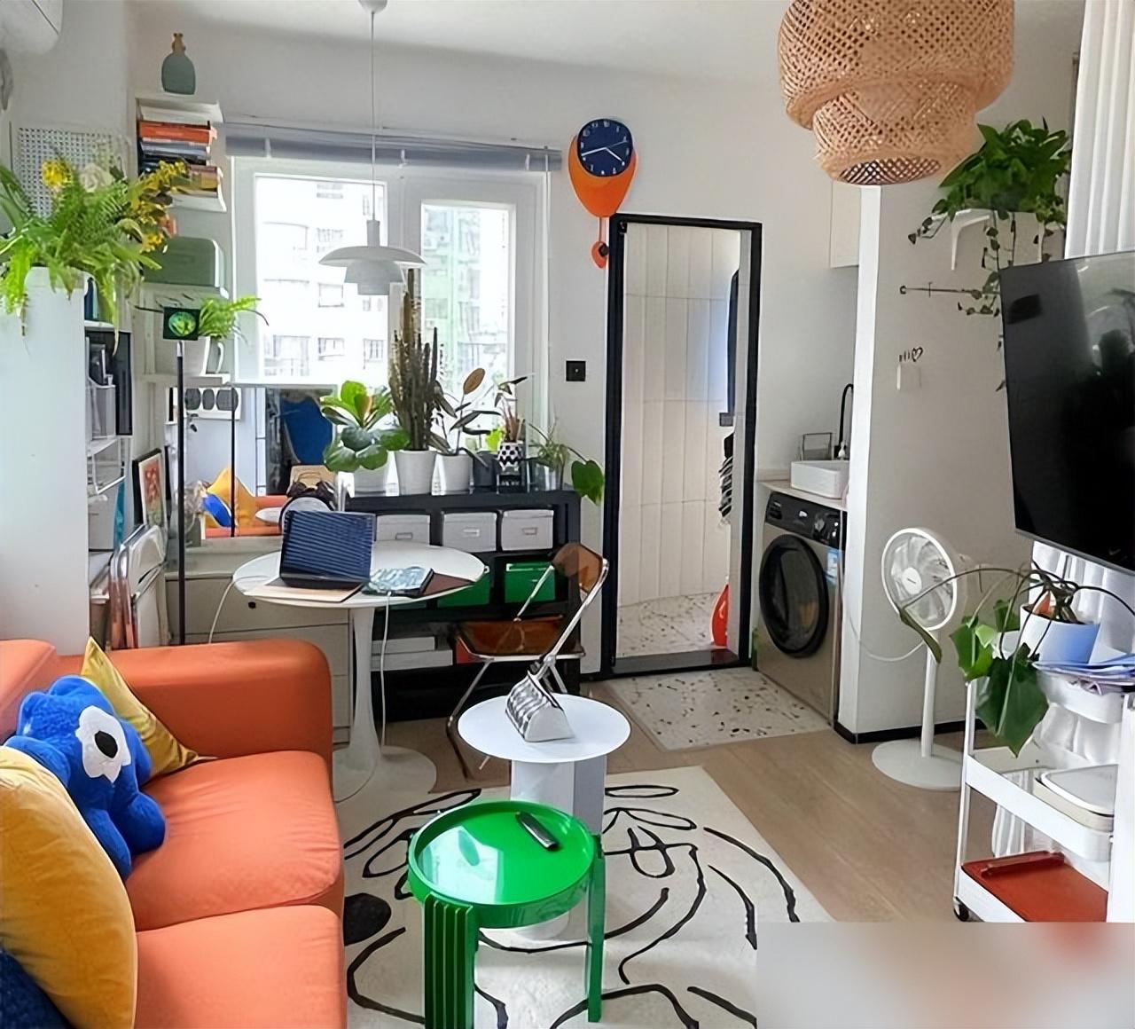 最絕的是17㎡的主區,窗簾軟隔斷分出客廳臥室,沙發電視矮櫃三件套擺得妥帖,窗邊小桌喫飯辦公兩用,綠蘿影子斜斜打在牆上——這哪是蝸居,分明是給日子套了個溫暖的殼。