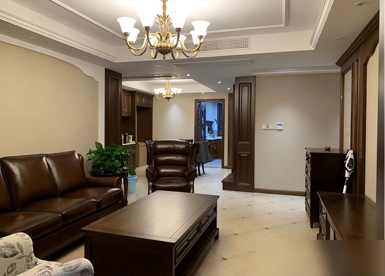 很多人一提中式就嫌老氣,其實胡桃木色系用得巧,反而能壓住大戶型的氣場。